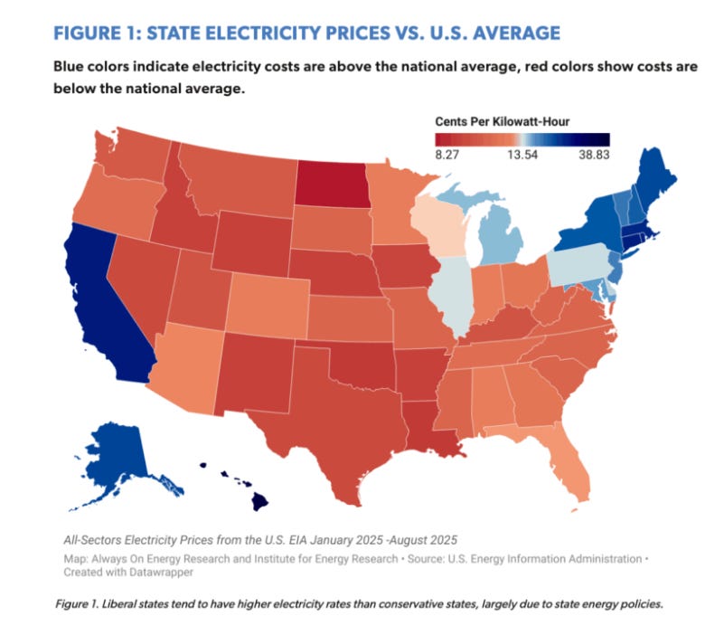 The data is clear: bluer states tend to have much higher electricity prices than red states.